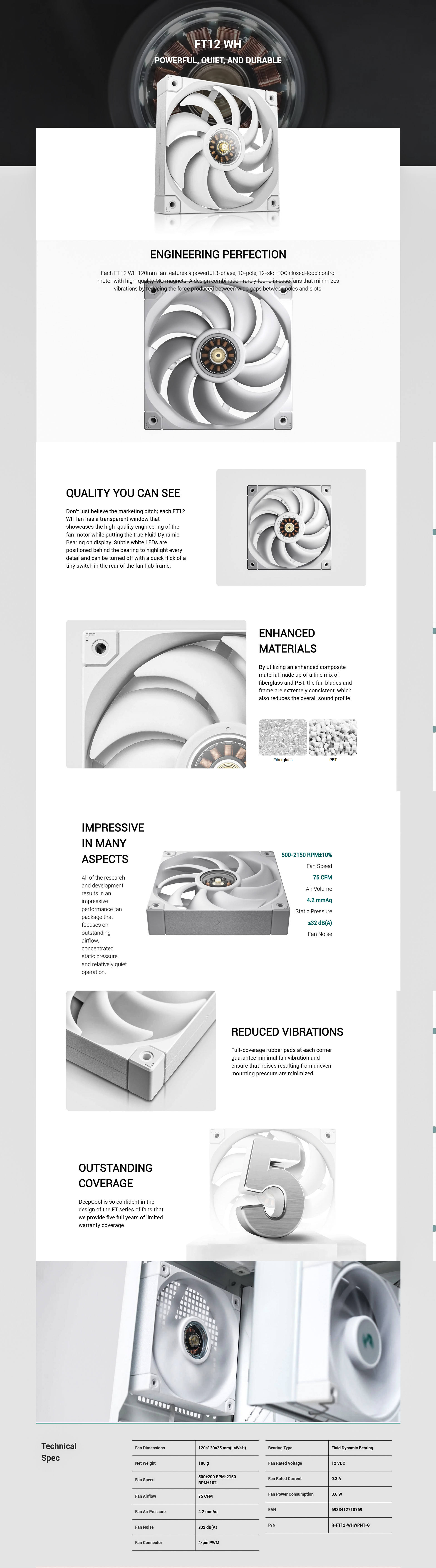 • DeepCool FT12 WH, 120mm FDB Fan, 3-Phase 10-pole 12-slot Motor, PWM, Transparent Center Window, Subtle White LED underglow, Whi