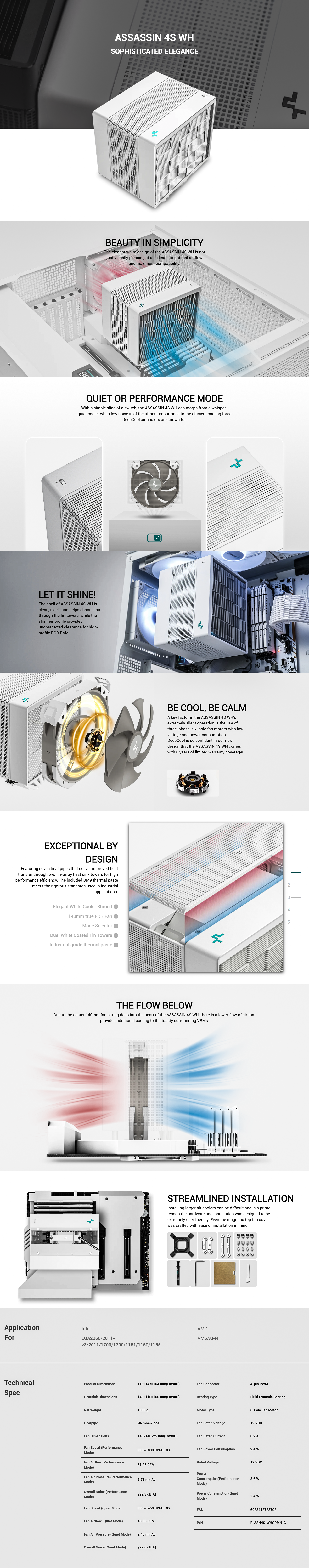 DeepCool ASSASSIN 4S WH Premium CPU Air Cooler, Dual-Tower, Single center 140mm FDB Fan, 7 Copper Heat Pipes, Quiet/Peformance Mode Switch, White