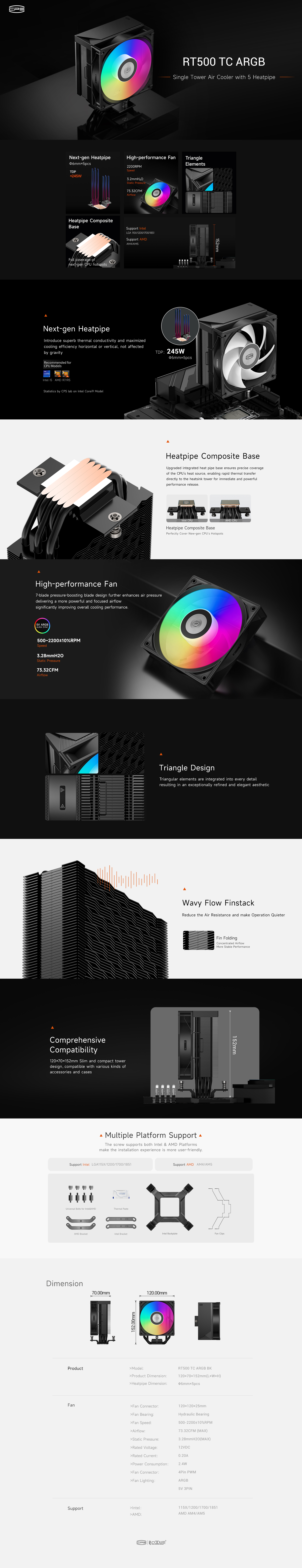 PCCOOLER CPS RT500ARGB-BK High-Performance CPU Cooler,5 Copper Heat Pipes ,Single TowerTotal,245W TDP