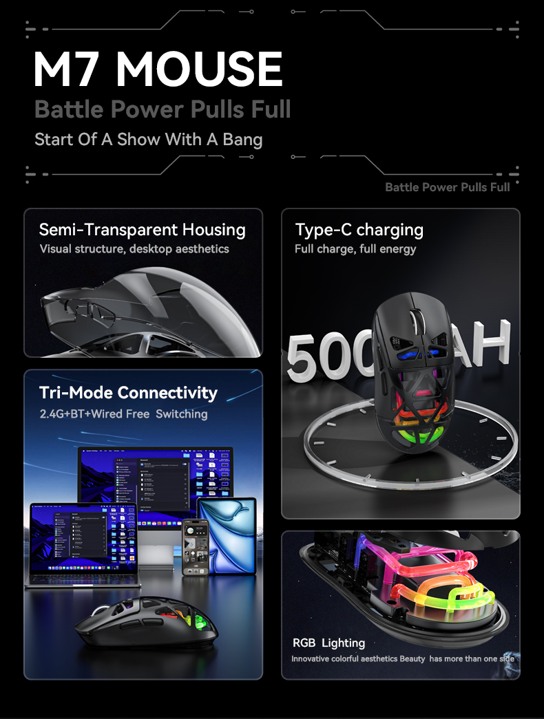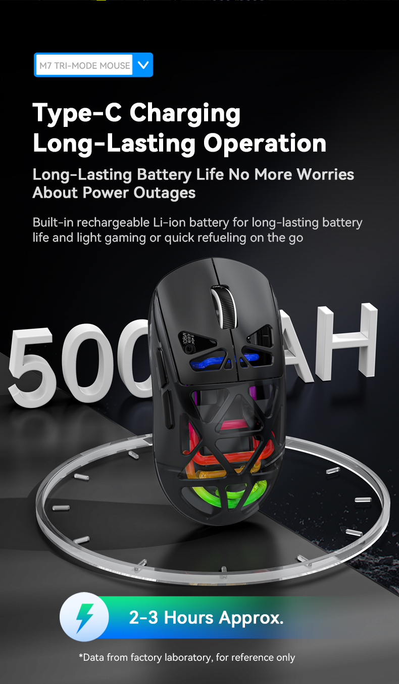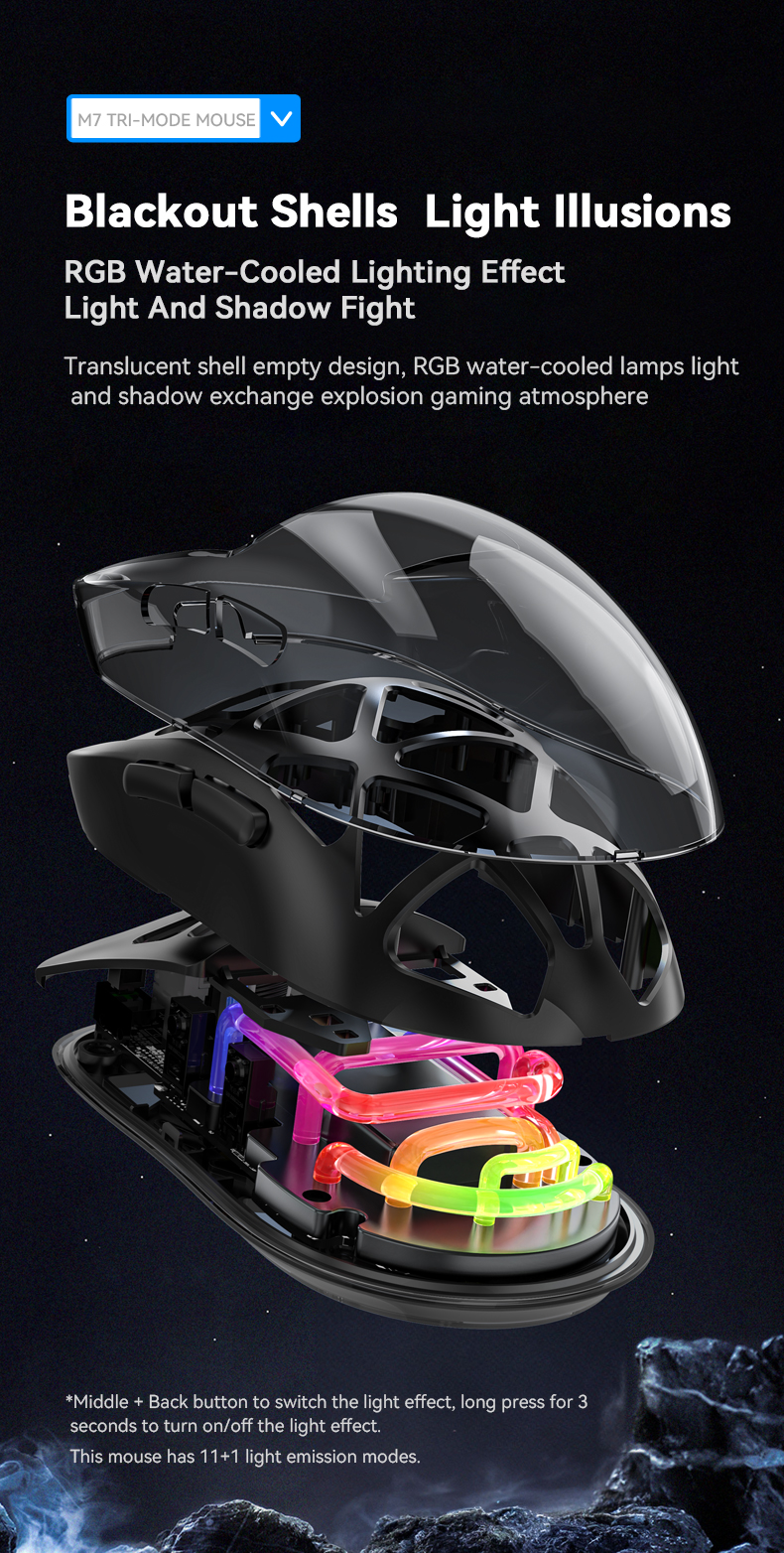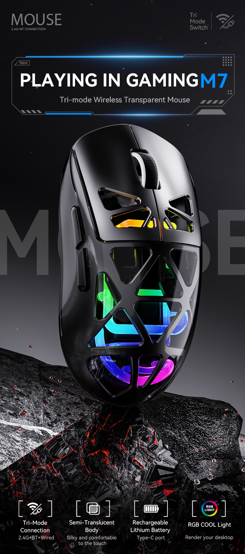 iCAN Black M7 Tri-Mode 2.4G/Bluetooth/USB RGB Gaming Mouse, 3600 DPI, Optical Sensor, Rechargeable 500 mA Battery, Keystroke Lifetime of 10 Million Cycles