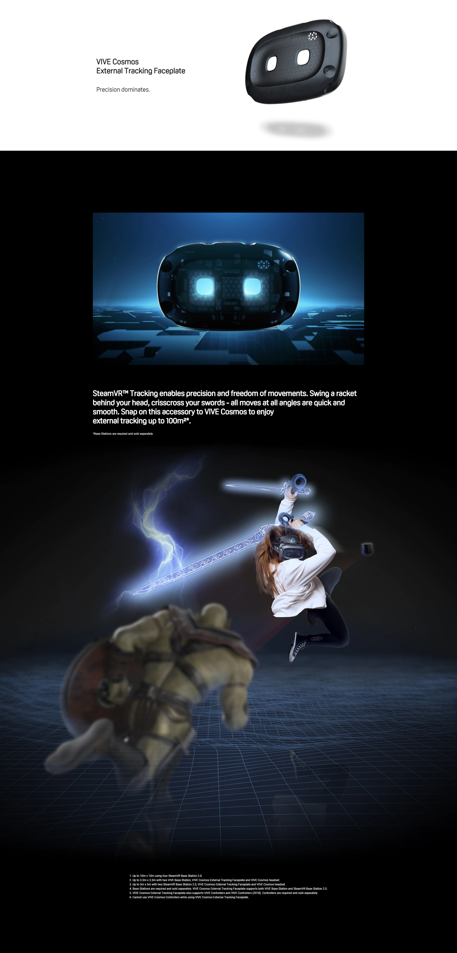 SteamVR™ Tracking enables precision and freedom of movements. Swing a racket behind your head, crisscross your swords - all moves at all angles are quick and smooth. Snap on this accessory to VIVE Cosmos to enjoy external tracking up to 1000 sq. ft*.