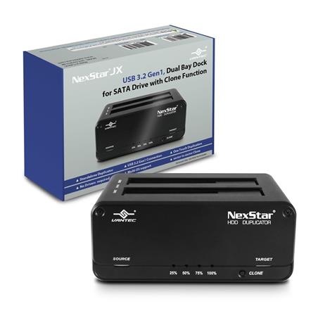 This third-generation NexStar JX Dual Bay Dock with Clone Function is designed to work with SATA III Drives and for duplicating SATA III drives of any size and function as a Dual Bay dock. It is capable of duplicating in any combination, HDD to HDD, HDD to SSD, SSD to HDD, or SSD to SSD in any capacity* This simple docking design offers quick access and removal of your SATA drives for storage or data duplication. With its built-in one-button cloning; you can copy sector-by-sector as a standalone device without even connecting to a computer. When connected to a computer, the device transforms into a Fast USB 3.2 Gen1 storage device for 2 high-capacities HDD or SSD. Whether your need is storage or duplication, the Vantec NexStar JX SATA III HDD Duplicator is the perfect solution.
