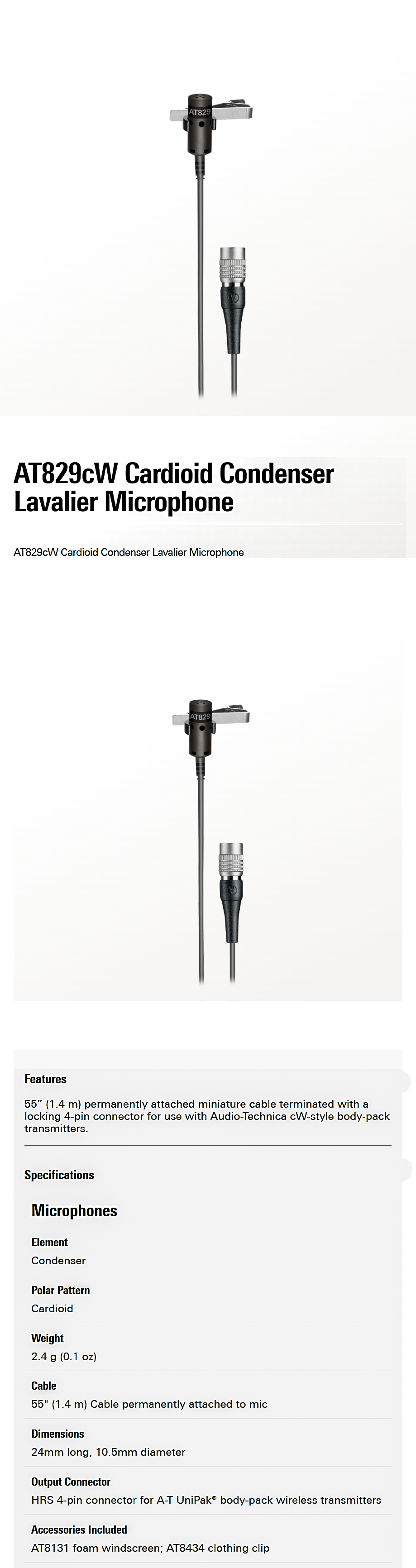 • AUDIO TECHNICA AT829cW Cardioid Condenser Lavalier Microphone