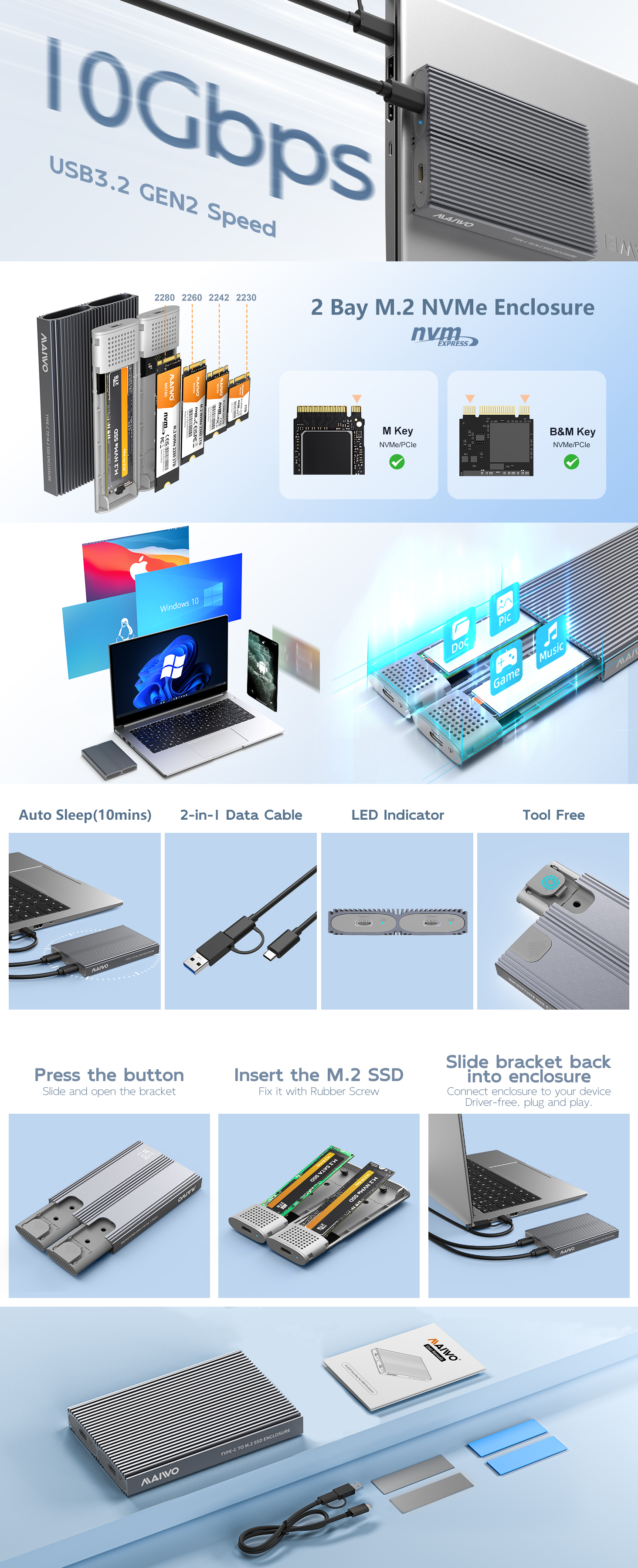 Maiwo K1202P2 Tool Free USB 3.2 Gen2×1 Type-C PCIe NVMe and SATA M.2 SSD Enclosure, Support 2pcs SATA or NVMe M.2 SSD