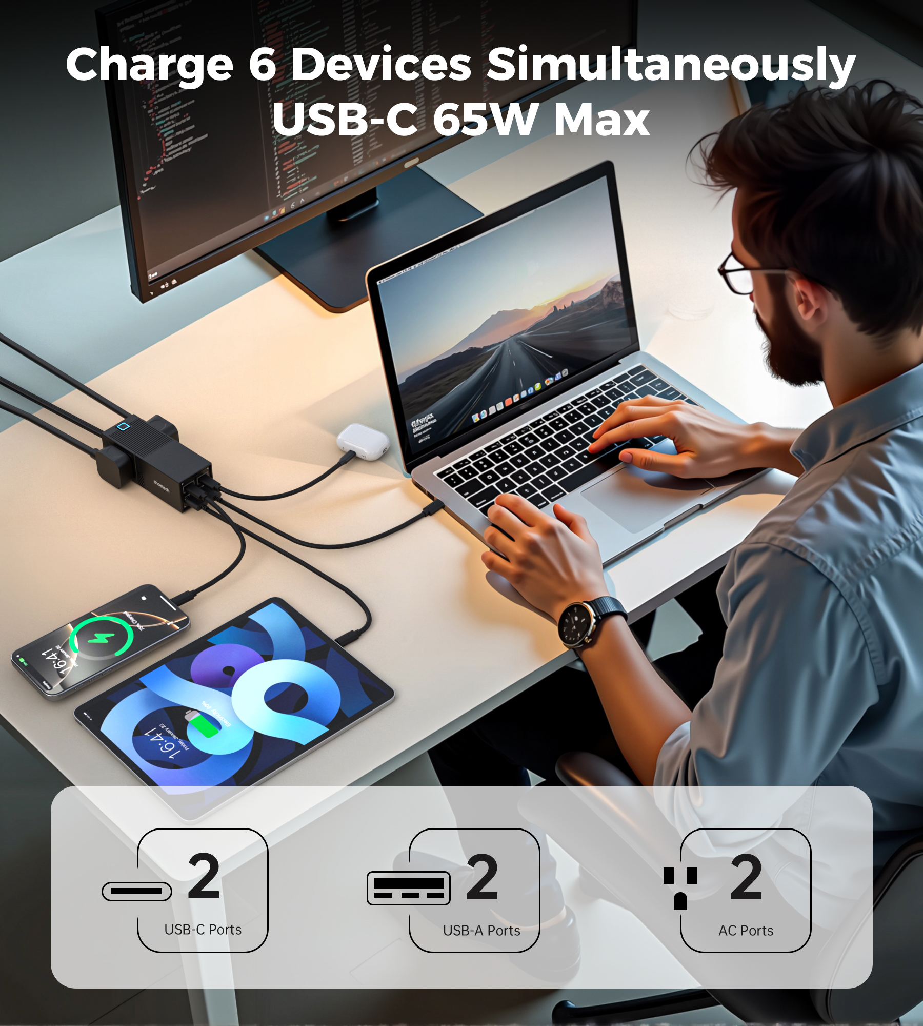 Choetech PD8054 2 Outlets 4 USB 65W Detachable Power Strip with 5ft Extension Cord(Open Box)
