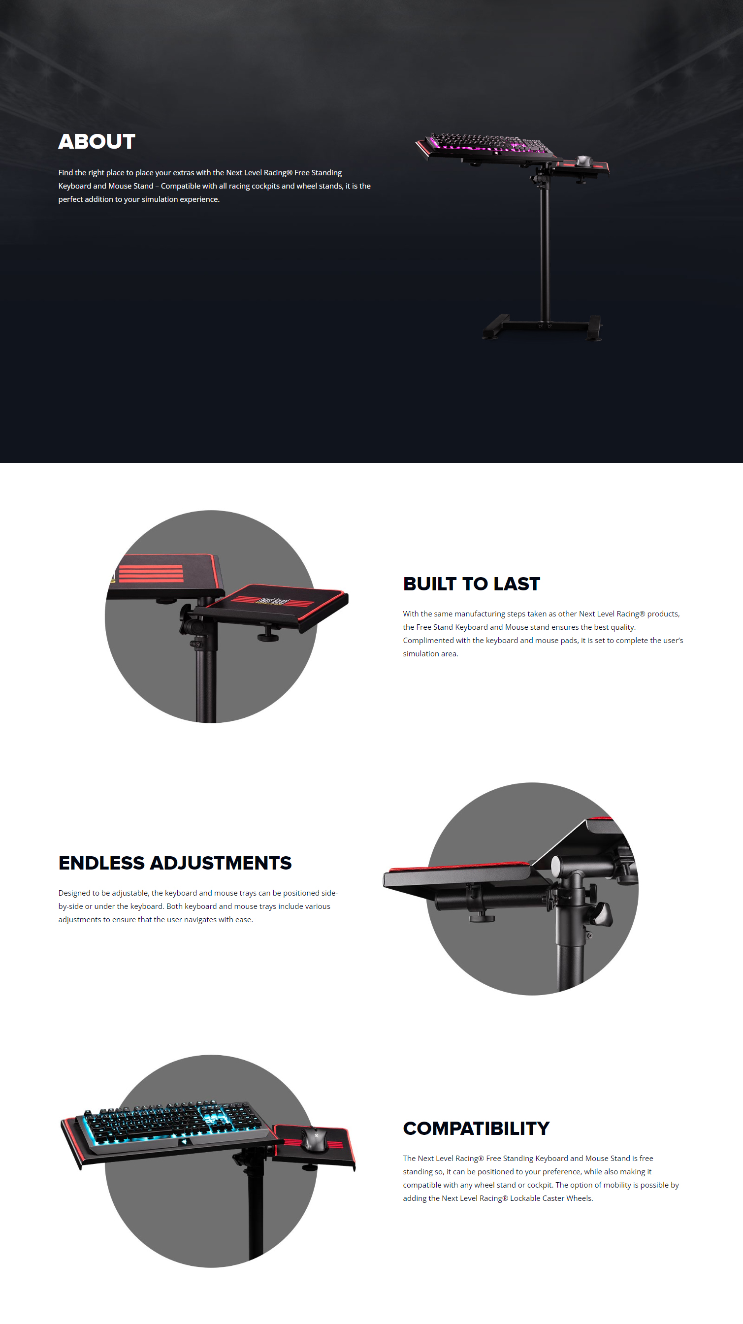 The Next Level Racing® Free Standing Keyboard and Mouse Stand is free standing so it can be positioned to your preference and also making it compatible with any wheel stand or cockpit. The keyboard and mouse trays can be positioned side by side or if preferred you can have the mouse positioned under the keyboard. Both keyboard and mouse trays include various adjustments.