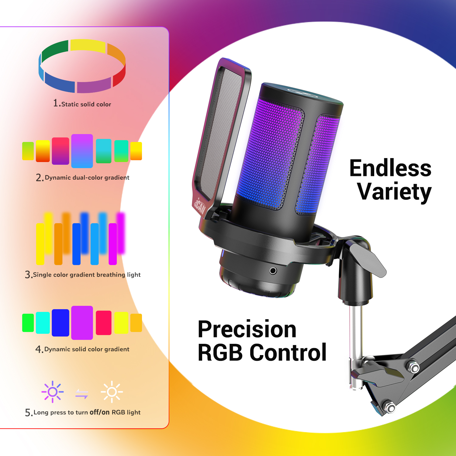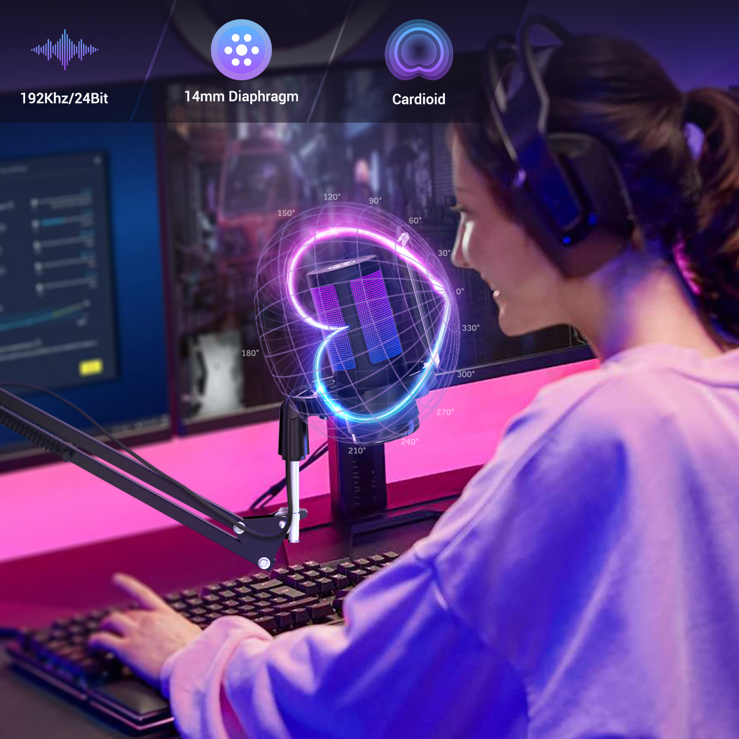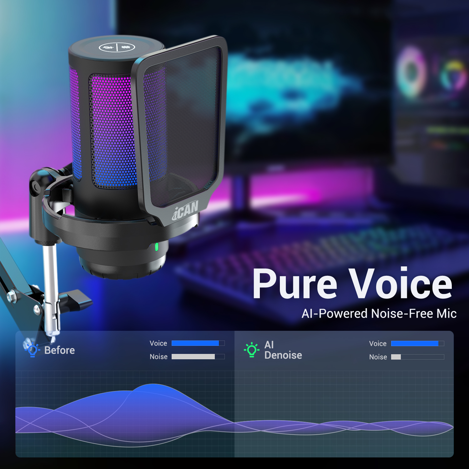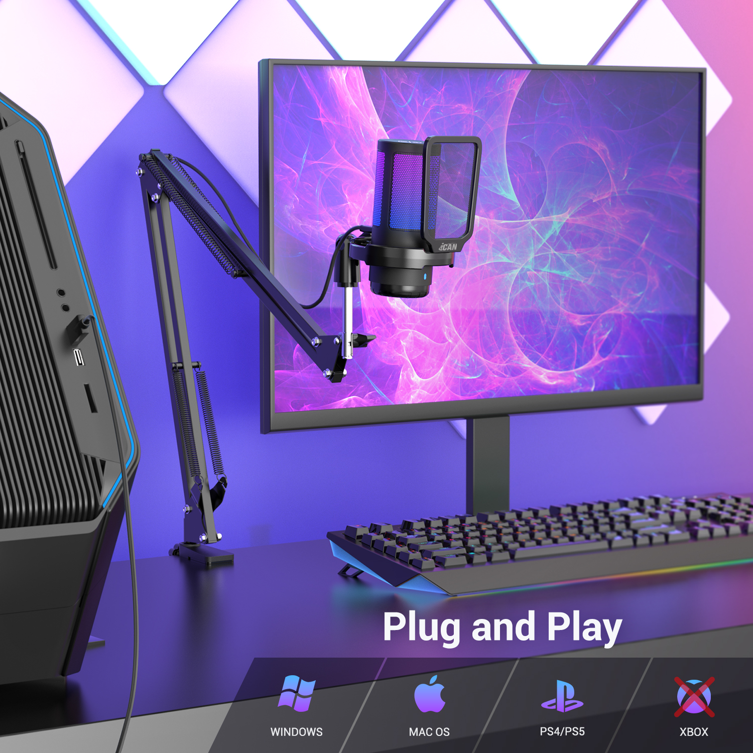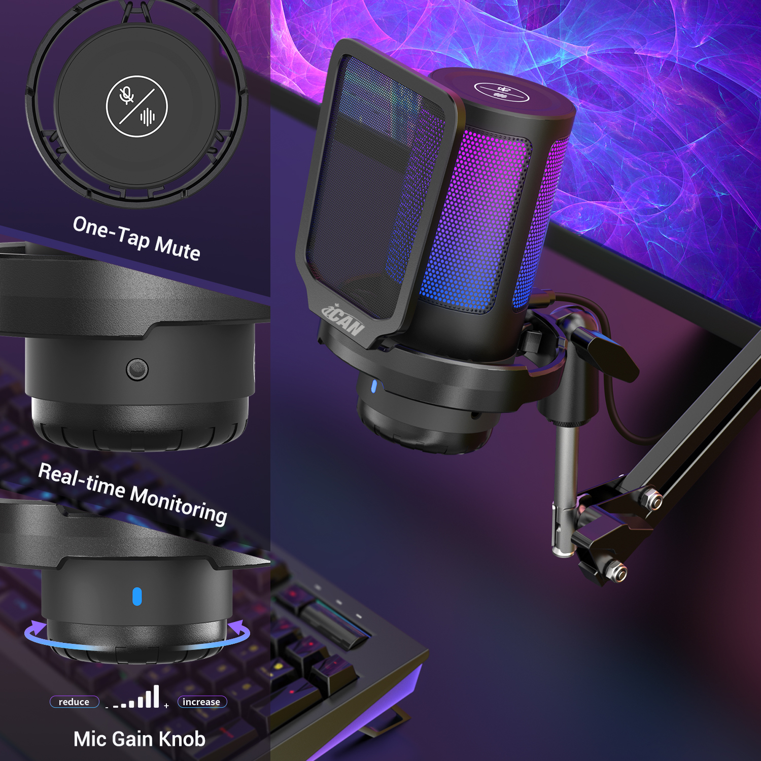 iCAN PM38T Gaming USB Microphone, Noise Cancellation Condenser mic with Mute, Gain, Monitoring, Boom Arm for Streaming, Podcast, Vocal, Twitch, YouTube, Discord, PC, Computer, PS4, PS5, Mac