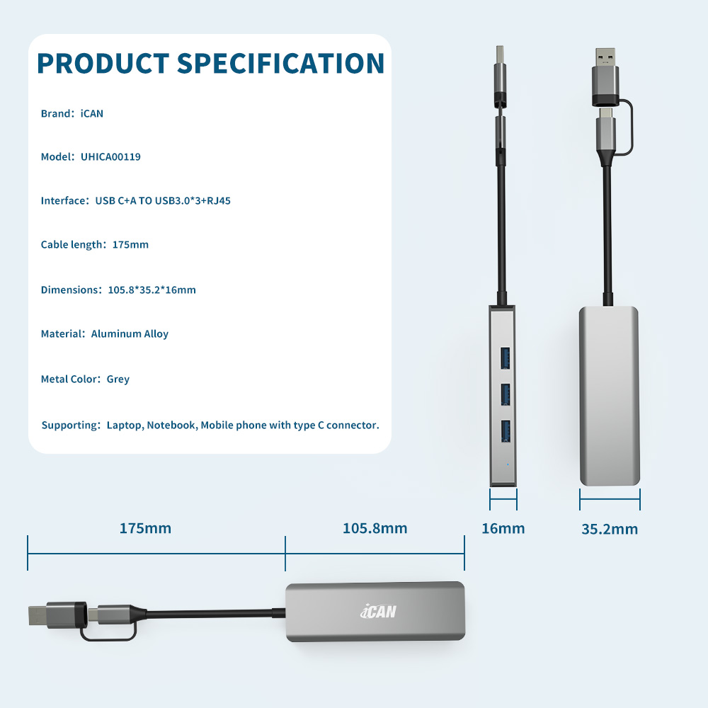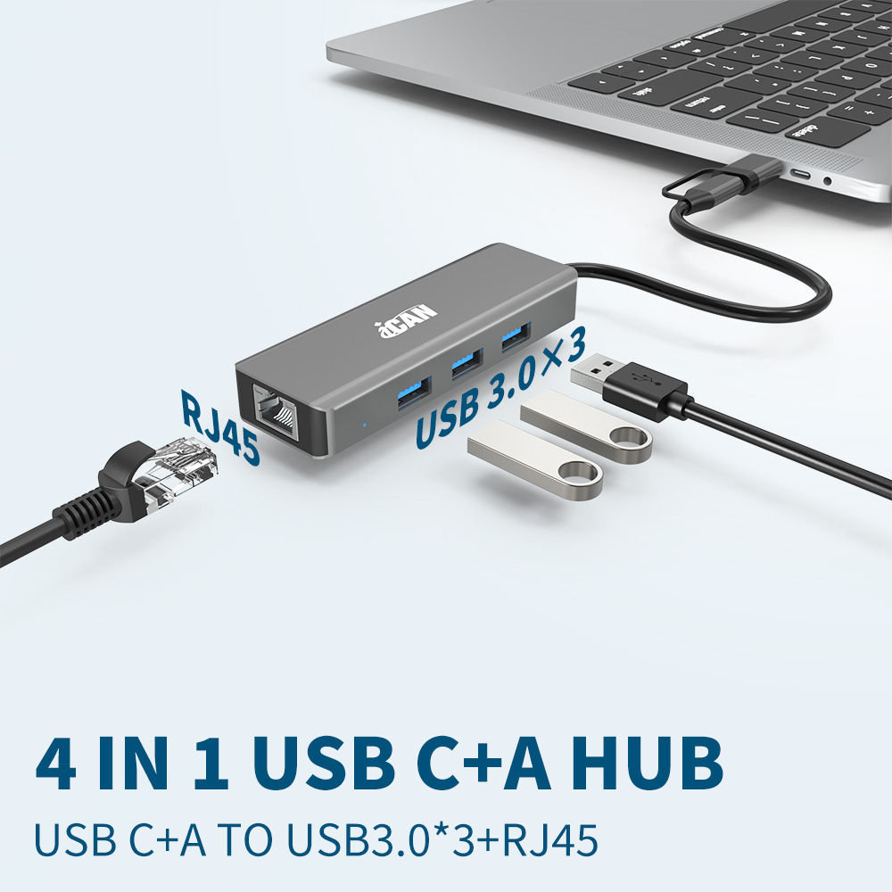 iCAN 4-in-1 USB 3.0 Ethernet Hub with Dual USB-A/C Connectors(Open Box)