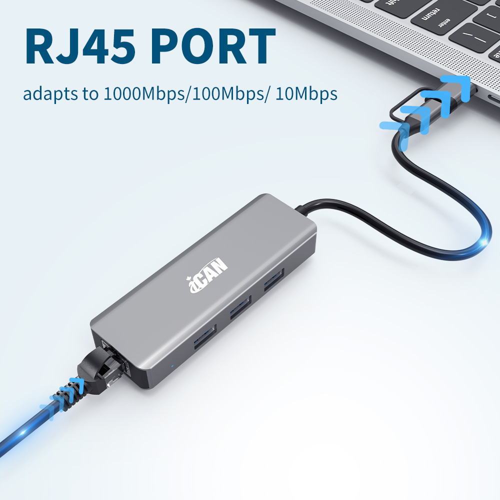 • iCAN 4-in-1 USB 3.0 Ethernet Hub with Dual USB-A/C Connectors(Open Box)
