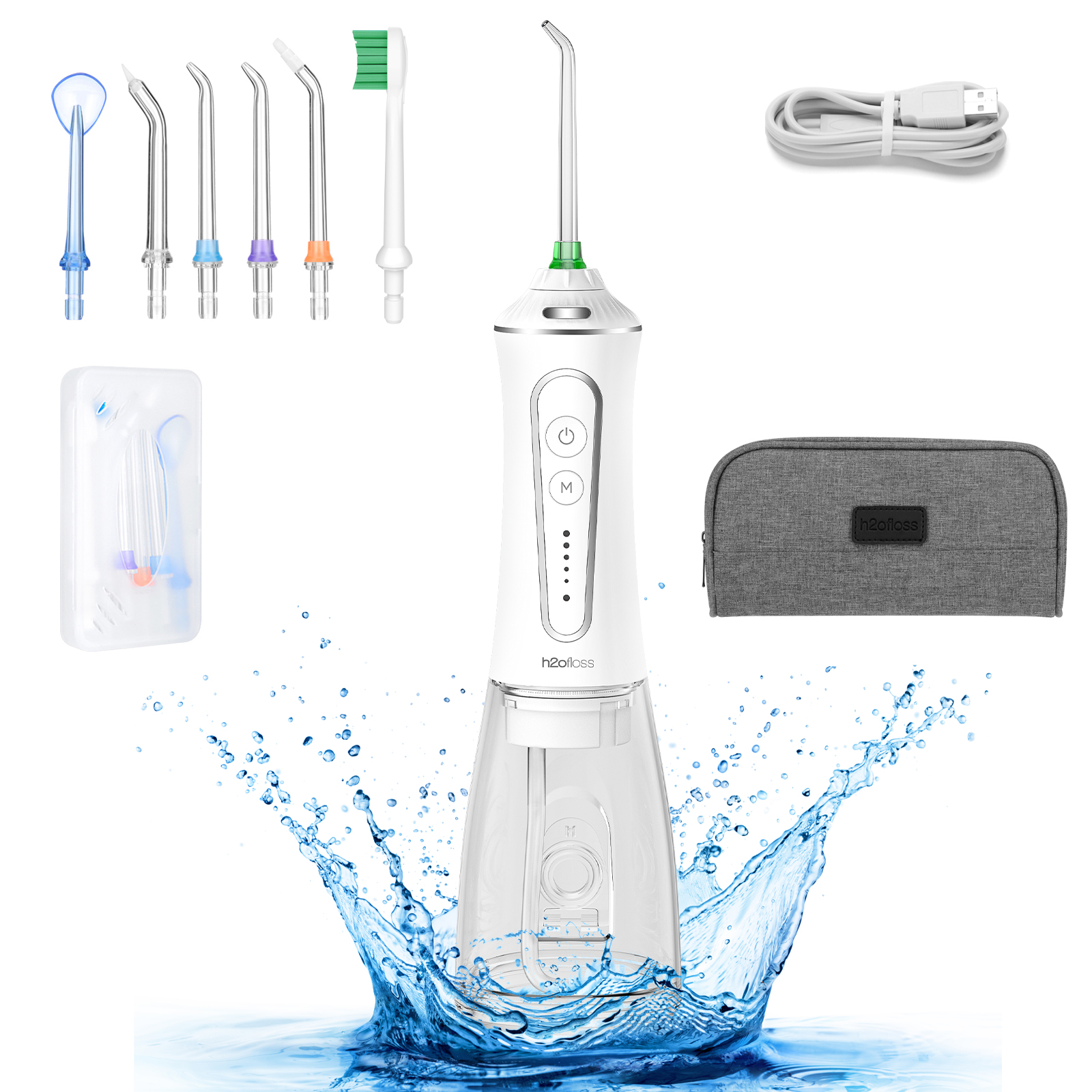 H2ofloss Oral Irrigator Set with 1*Water Flosser + 1*Travel Bag + 5*Nozzle Tips + 1*brush head + 1*transparent box, 300ml Tank, 40-110 PSI Water Pressure, IPX7 Waterproof, 5 Work Modes, LED Indicator Color, Package Including 1 USB Cable + 1 User Manual, White.