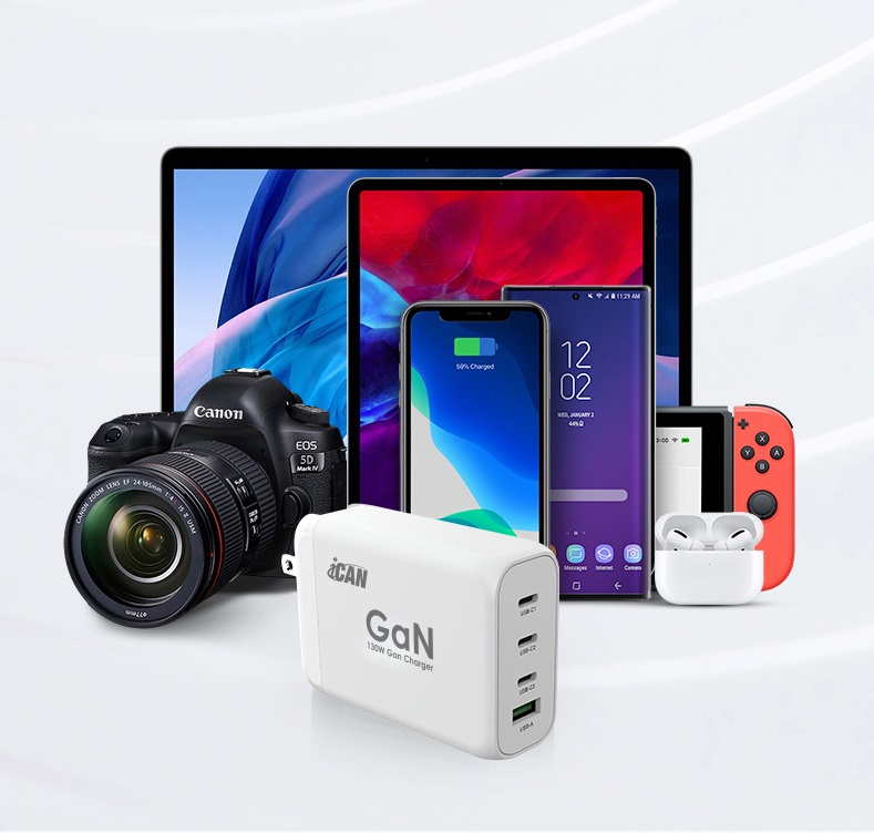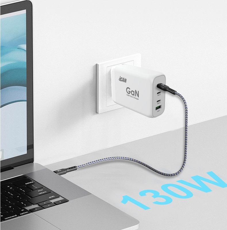 • iCAN Chargeur pour ordinateur portable USB-C GaN PD 4 ports 130 W