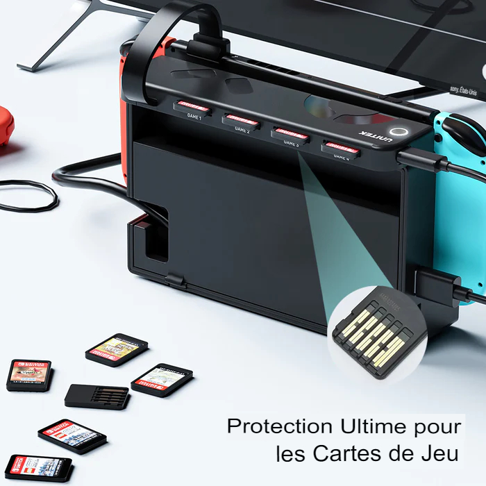 • Conception Intégrée : Le lecteur de cartes multi-jeux peut être solidement fixé sur le dessus de la station d'accueil officielle de la Switch. Les utilisateurs doivent simplement attacher le lecteur de cartes de jeu à la base. Pas de soucis concernant le blocage de la ventilation et l'impact sur le refroidissement de la console.