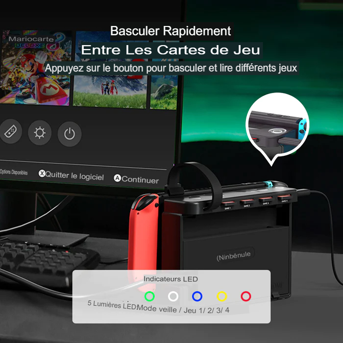 • Changement de Jeu en un Seul Bouton : En insérant les cartes de jeu dans les emplacements de lecture de cartes de jeu 1 à 4, les utilisateurs peuvent utiliser le bouton de commutation LED sur l'appareil pour changer rapidement entre les jeux.