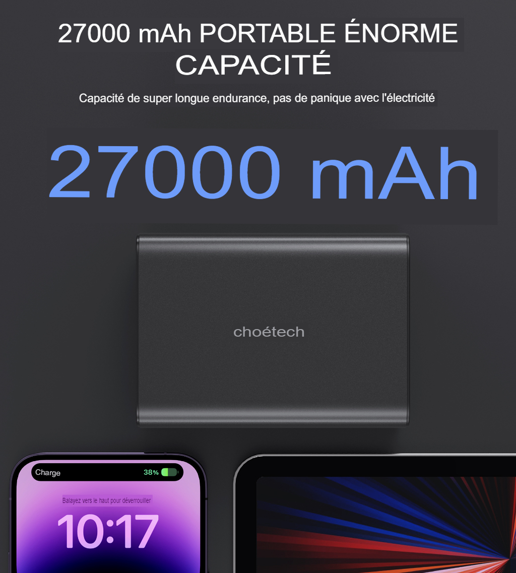 • Choetech Batterie externe de charge rapide PD de 27 000 mAh, 222,5 W