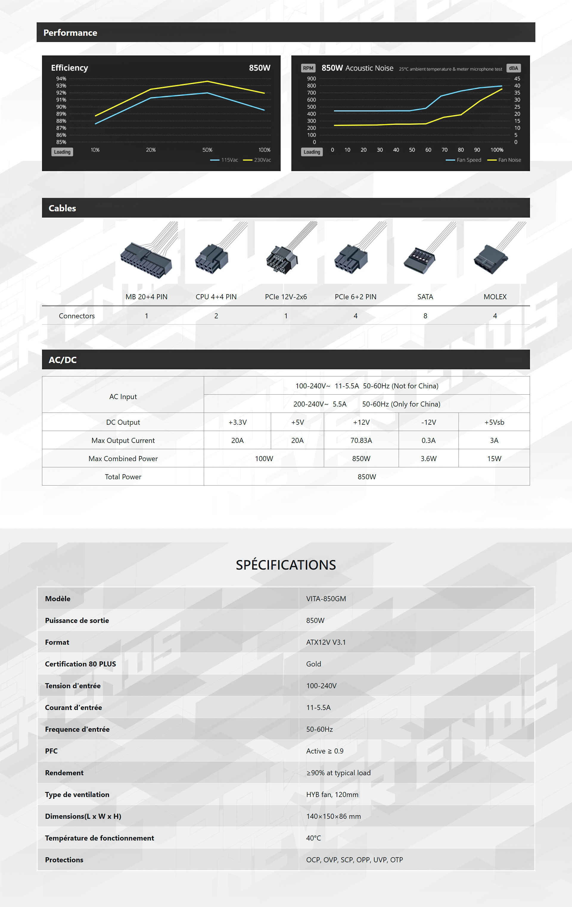 FSP VITA-850GM Bloc d'alimentation ATX 3.1, 850 Watts, 80+ Gold certifié