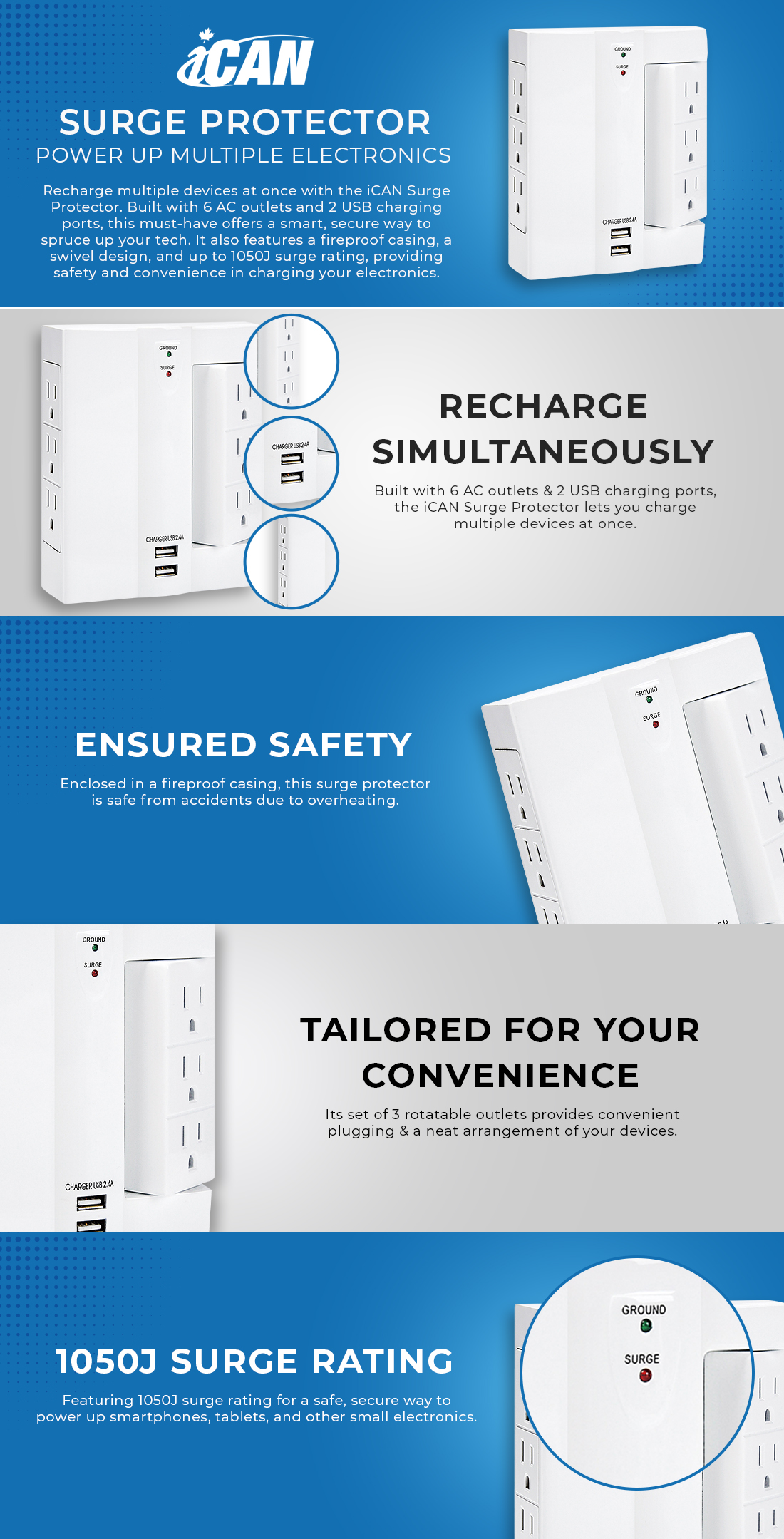 iCAN FL-JC45S Protecteur de surtension pour robinet mural rotatif, 6 prises, 2 USB-A(Boîte ouverte)